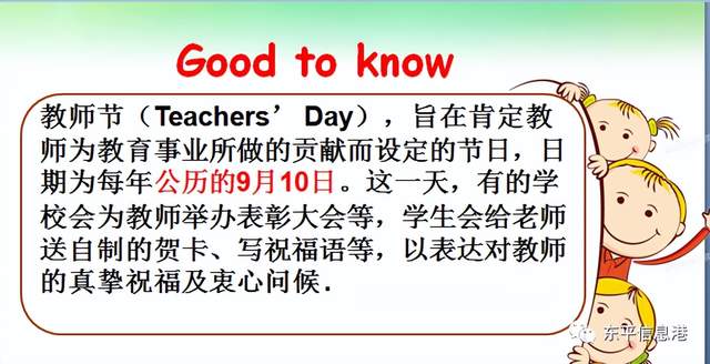 介绍教师节。培养学生们养成尊师敬长的好品格。